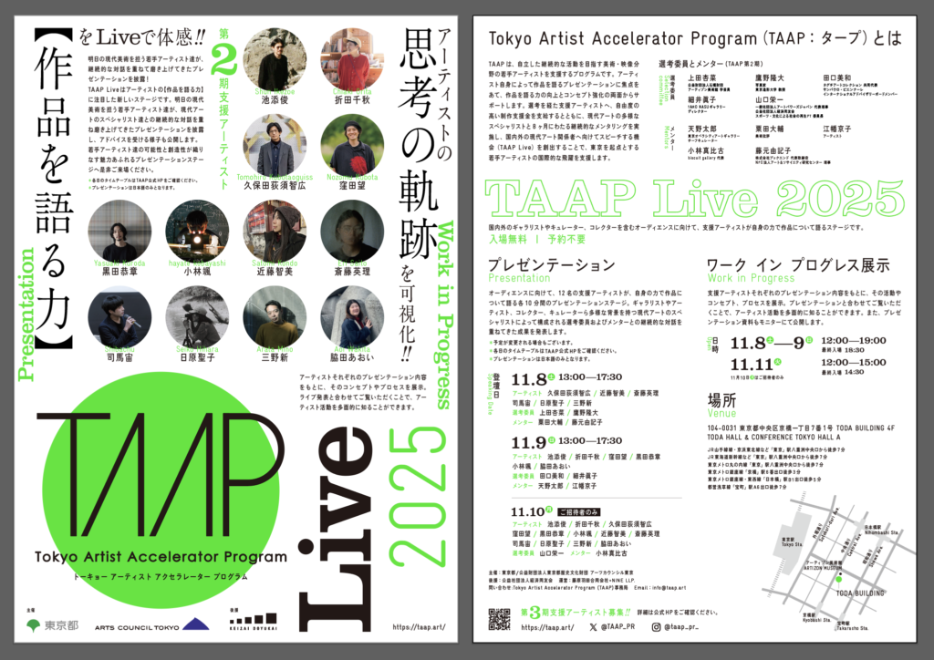 東京で開催されるアートイベントの機会を捉え、国内外のギャラリストやキュレーター、コレクターを含むオーディエンスに向けて、支援アーティストが自身の力で作品について語るステージ「TAAP Live 2025」を実施します。